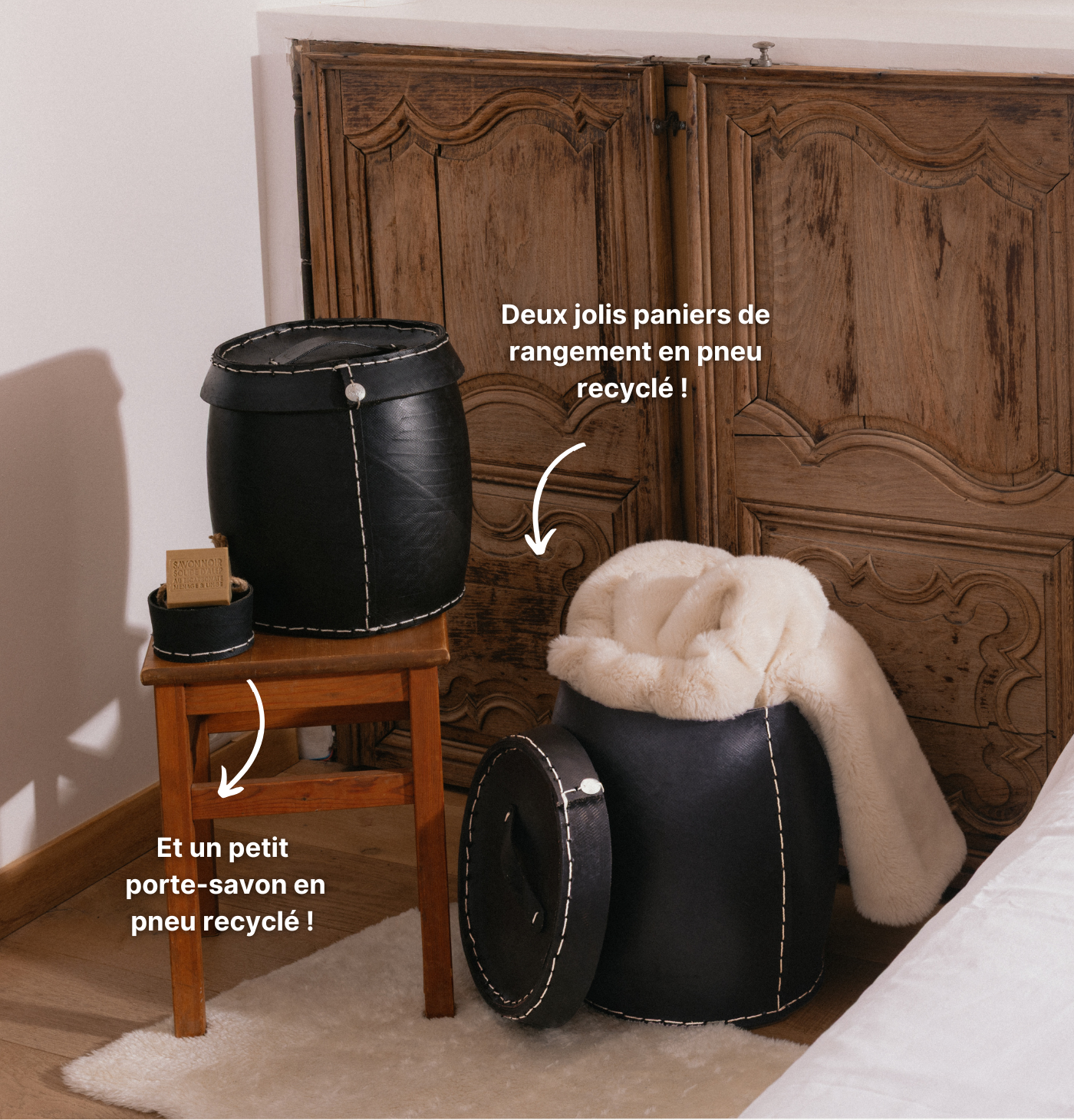 Two storage baskets and a lovely soap dish made from recycled tires!