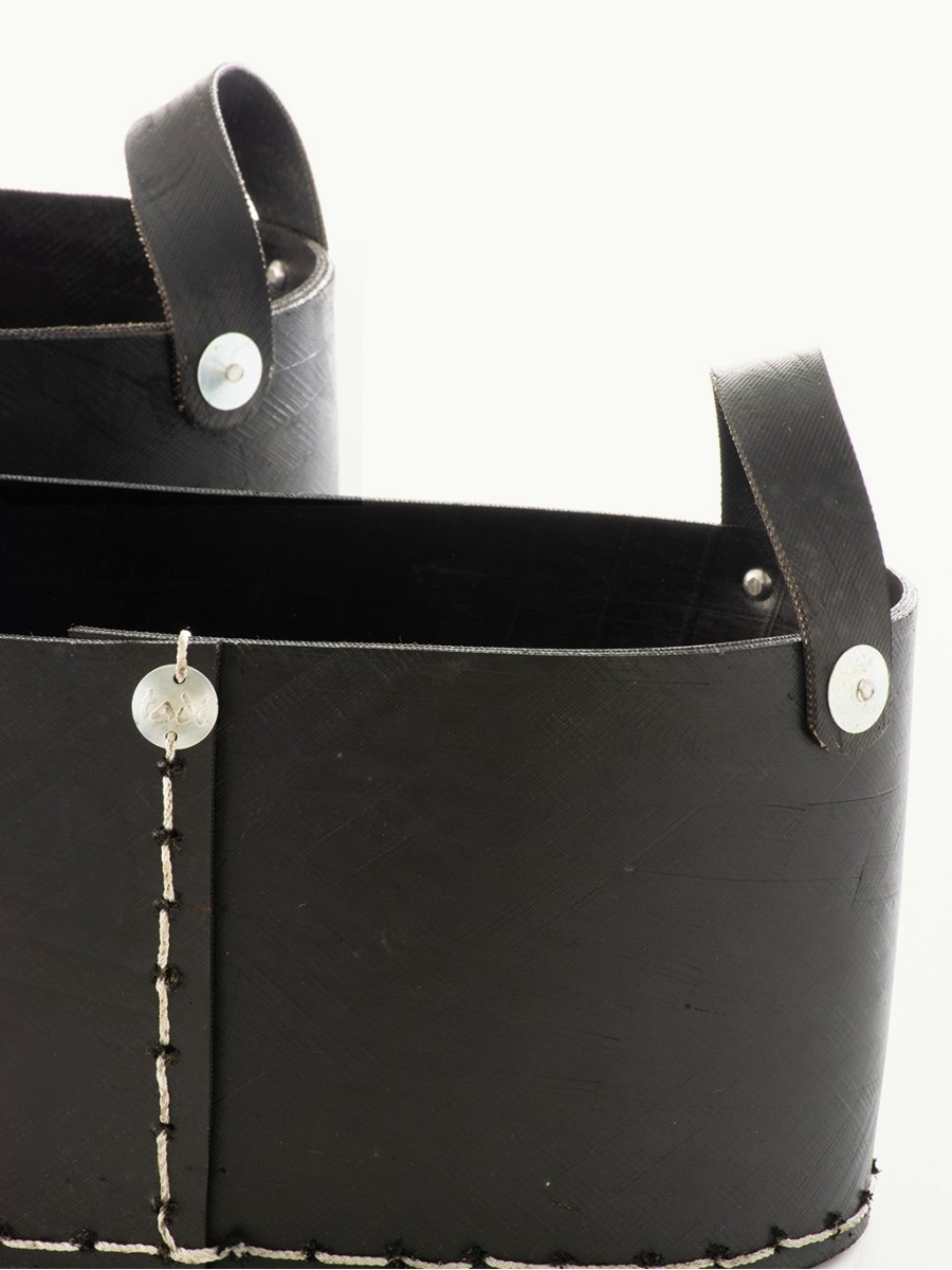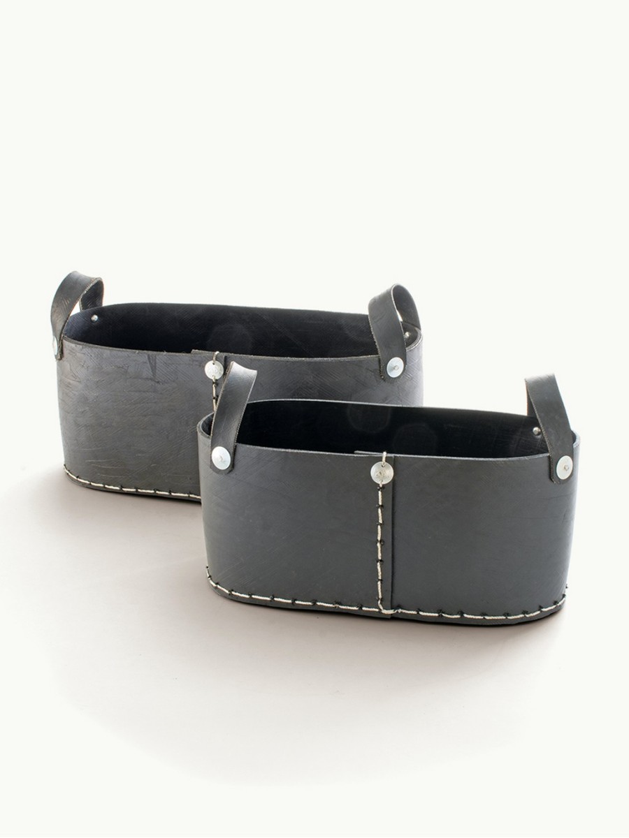 Two nested balcony baskets, handmade from recycled tires. Dimensions: 44 cm × 20 cm × h 20 cm & 38 cm × 18 cm × h 18 cm.