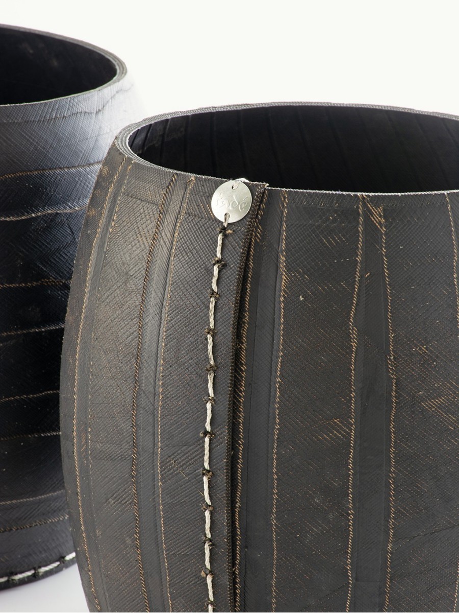 Set of 2 nesting baskets from the Zebra collection, hand-sewn from recycled tires. Size: 28 x H30cm; diameter: 35cm.