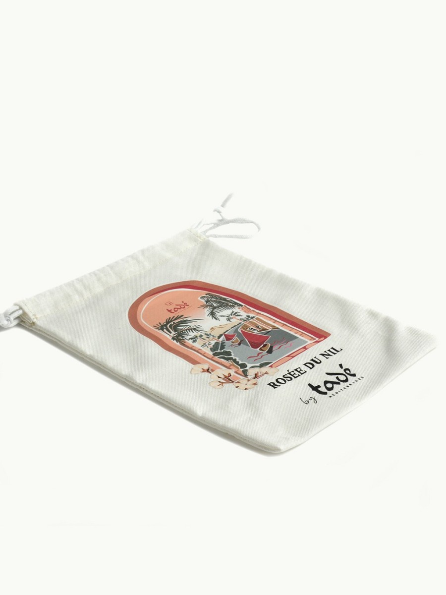 White cotton bag illustrated, 25x30 cm in size, with a drawstring. Ideal for offering or treating yourself, storing or transporting Tadé products from the Rosée du Nil - Coton range.