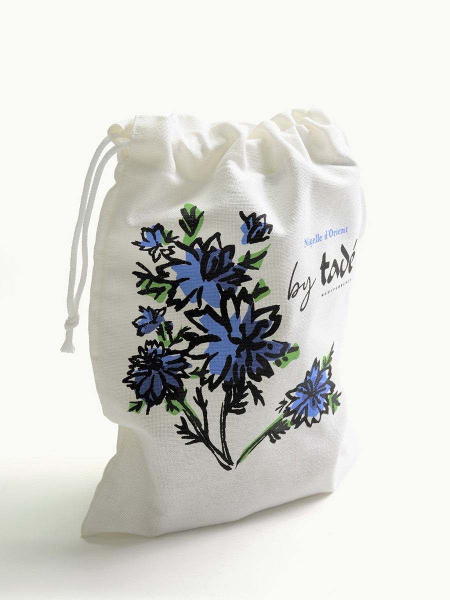 White cotton bag illustrated, 25x30 cm in size, with drawstring. Ideal for giving or treating yourself, storing or transporting Tadé skincare products from the Nigella d'Orient range.